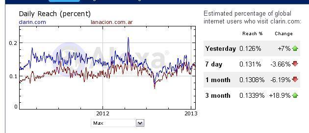 - Tendencias en consumos culturales. Según los ratings de Alexa Clarin.com ya no es la web de noticias más visitada de la Argentina y pierde su lugar ante lanacion.com (debe tenerse en cuenta que el número de Clarín tiene cierto doping porque incluye visitantes que juegan al Gran DT).